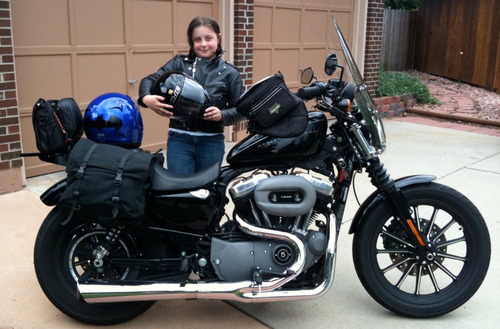 I bought Helen her own jacket, helmet, and boots. I found a windshield and backrest on eBay for the Sportster. In a moment of inspiration, I bought two large dog collars from PetSmart. I wore one. She wore one. I clipped them together with carabiners. If she fell asleep on the back, I wouldn’t have to worry. We loaded the Sportster up with bits of luggage I had collected over the years. Finally, I rooted up a big Batman decal and slapped it on the back of my helmet.