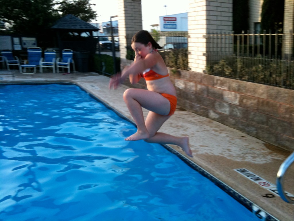 We made Decatur, TX, that evening and staged a shot of Helen leaping into the motel’s pool, just to assure everybody that everything was great, nothing could be better, this motorcycling business really isn’t risky at all.