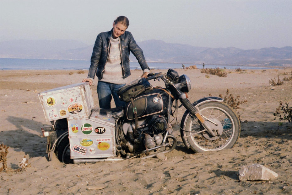 Elspeth Beard, her BMW axle deep in Turkish sand. In 1982 she left London for the America, New Zealand, Australia, Thailand, India, and then, quickly, back to London.