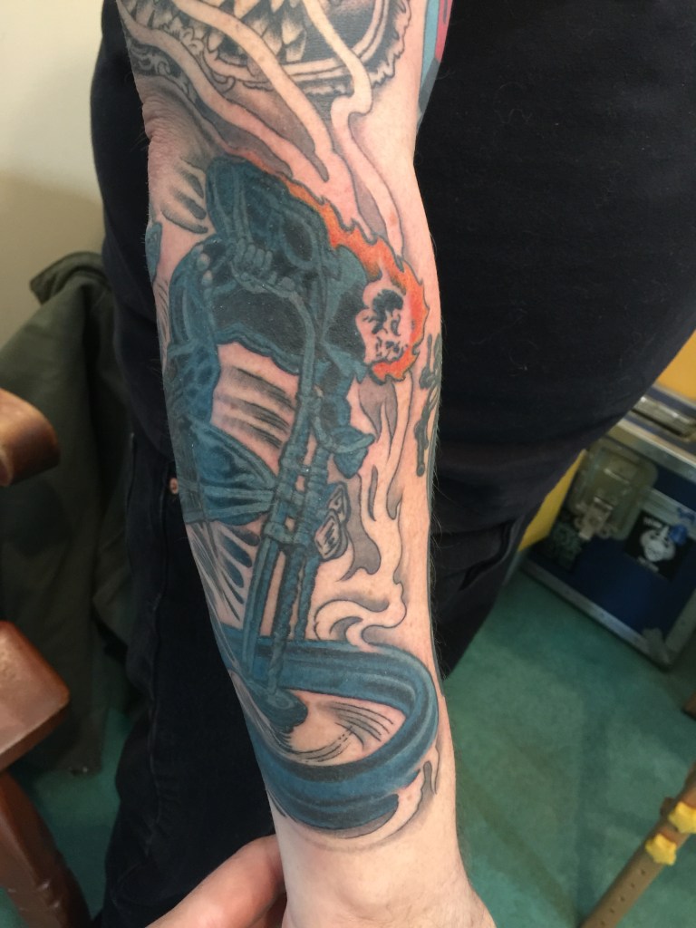 Mike Ploog’s first panel of Ghost Rider, from Marvel Spotlight #5 , on my forearm