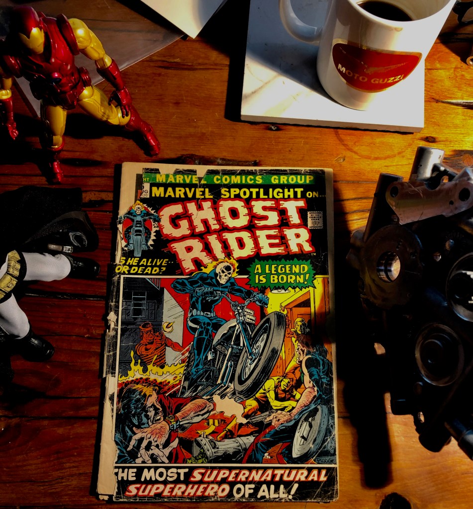 Ghost Rider has had many forms by now. He debuted in 1972, written by Gary Friedrich, drawn by Mike Ploog, with “aid and abetment” by Roy Thomas.
