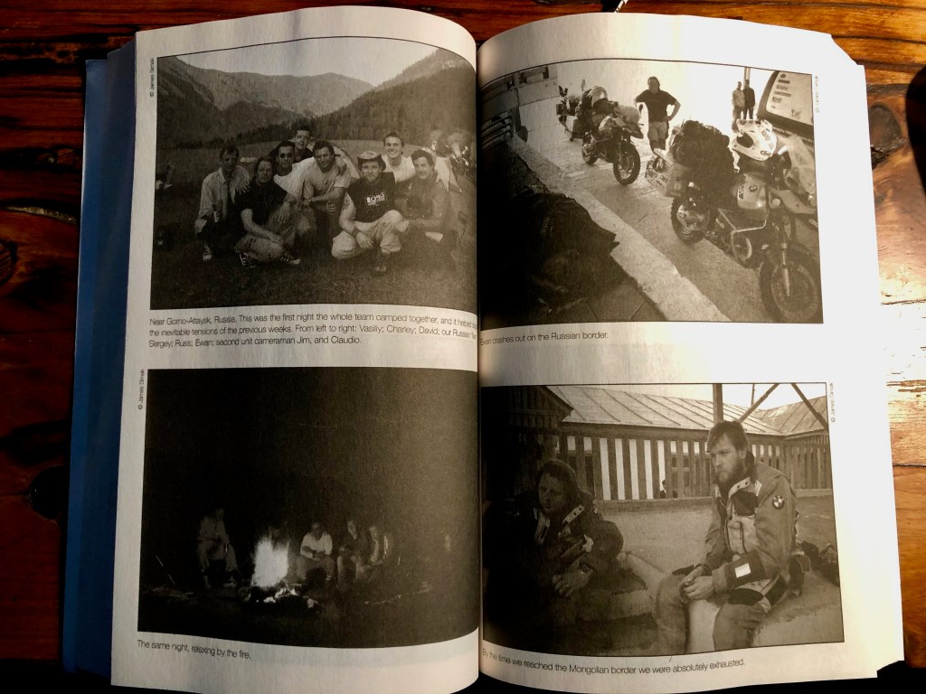 The book alternates narrative voices between McGregor and Boorman, each telling a passage of travel and then handing it back to the other. Making a motorcycle show takes a lot of work. An entire paid staff is roped in to supply visas, passports, and papers. BMW supplies three bikes. There are training sessions on an off road course from BMW and with automatic weapons from a former SAS officer. There are two chase trucks, and it seems a total of at least six on-the-road support staff. As it turns out, the staff has as much of an adventure as McGregor and Boorman. Still, they remain staff, mostly invisible in the book, often scolded, and contriving little surprises for the two mates right through to the end.  As a result, there is a little bit of Downton Abbey in Long Way Round, for it’s a Motorcycle Buddy Experience of celebrities, with servants who are kept out of sight. That makes it a bit of an odd read, after Ted Simon’s solo, and deeply anti-capitalist, experience.