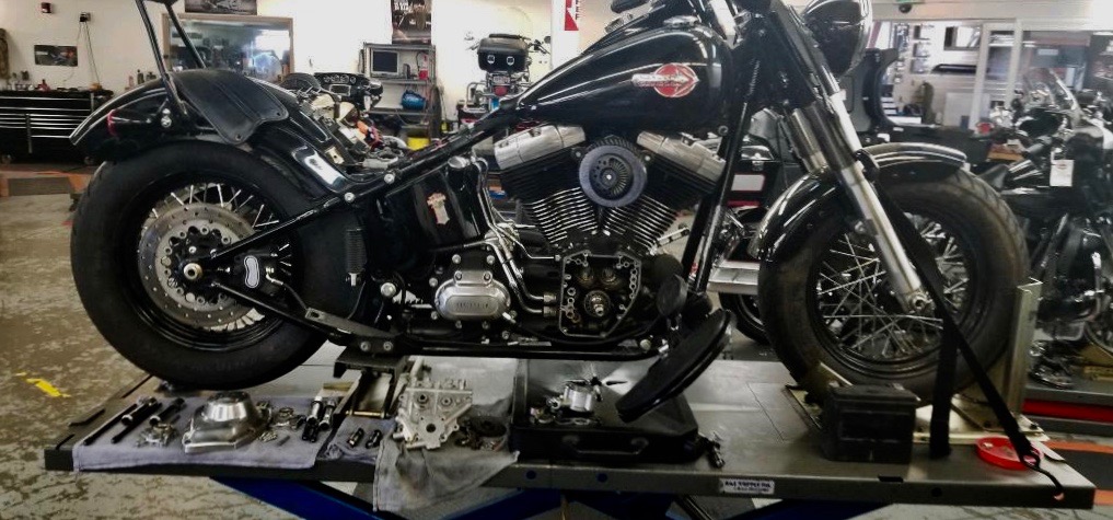 The Softail on the lift at High Country Harley Davidson Yesterday, I went up to visit the Harley in the shop. Sort of like visiting a friend in rehab—one feels badly that the friend has fallen apart and still loves him or her dearly. Justin, the service manager at High Country Harley Davidson, took me …